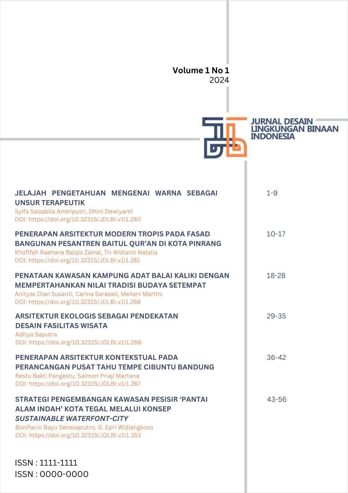 Edisi perdana Jurnal Desain Lingkungan Binaan Indonesia (JDLBI) Volume 1 Nomor 1 Tahun 2024 menyajikan enam artikel yang membahas berbagai pendekatan dalam desain lingkungan binaan, mulai dari eksplorasi warna sebagai unsur terapeutik dalam ruang, penerapan arsitektur modern tropis pada fasad pesantren di Pinrang, hingga strategi pelestarian kampung adat Balai Kaliki berbasis nilai budaya lokal. Isu keberlanjutan juga hadir melalui pendekatan ekologi dalam desain fasilitas wisata, penerapan arsitektur kontekstual pada pusat tahu tempe di Bandung, serta konsep sustainable waterfront city untuk pengembangan kawasan pesisir Pantai Alam Indah di Tegal.