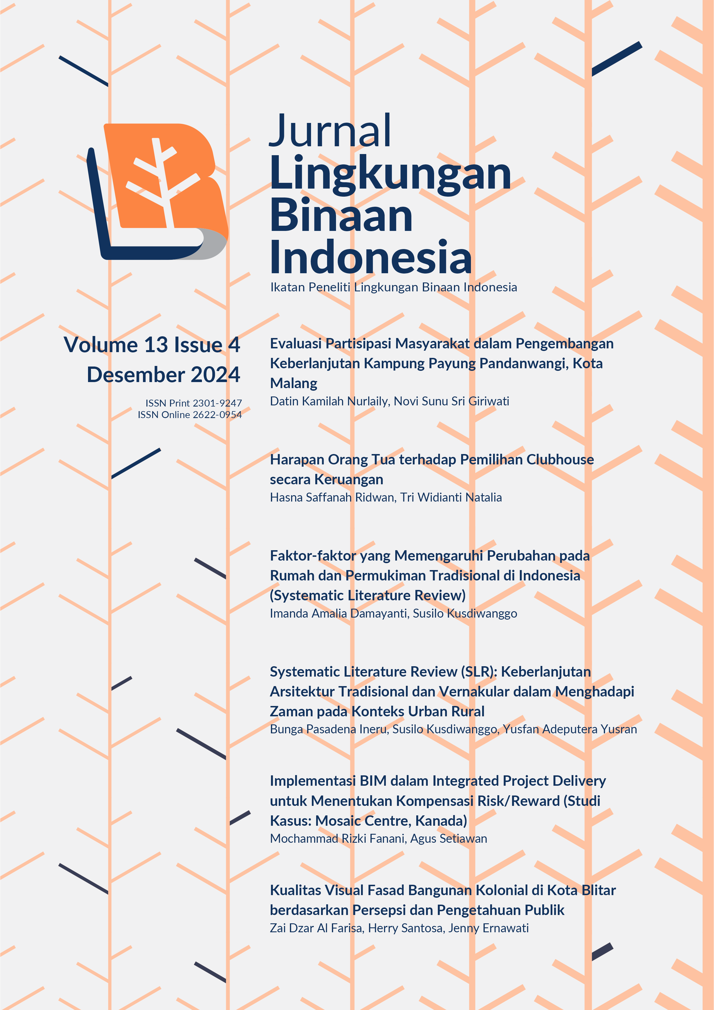 Edisi ini memuat enam artikel hasil penelitian. Naskah pertama memuat ketertarikan penulis terhadap masalah Evaluasi Partisipasi Masyarakat dalam Pengembangan Keberlanjutan Kampung Payung Pandanwangi, Kota Malang. Naskah kedua menyoroti masalah Harapan Orang Tua terhadap Pemilihan Clubhouse secara Keruangan. Topik Systematic Literature Review (SLR) yang cukup populer juga disajikan dalam Naskah ketiga yang membahas mengenai Systematic Literature Review (SLR): Keberlanjutan Arsitektur Tradisional dan Vernakular dalam Menghadapi Zaman pada Konteks Urban Rural, serta pada Naskah keempat yang membahas Faktor-faktor yang Memengaruhi Perubahan pada Rumah dan Permukiman Tradisional di Indonesia (Systematic Literature Review). Topik mengenai Building Information Modelling (BIM) dibahas pada paper kelima yang menyoroti Implementasi BIM dalam Integrated Project Delivery untuk Menentukan Kompensasi Risk/Reward (Studi Kasus: Mosaic Centre, Kanada). Topik mengenai Kualitas Visual Fasad Bangunan Kolonial di Kota Blitar berdasarkan Persepsi dan Pengetahuan Publik menjadi tulisan dalam Naskah keenam pada edisi ini.