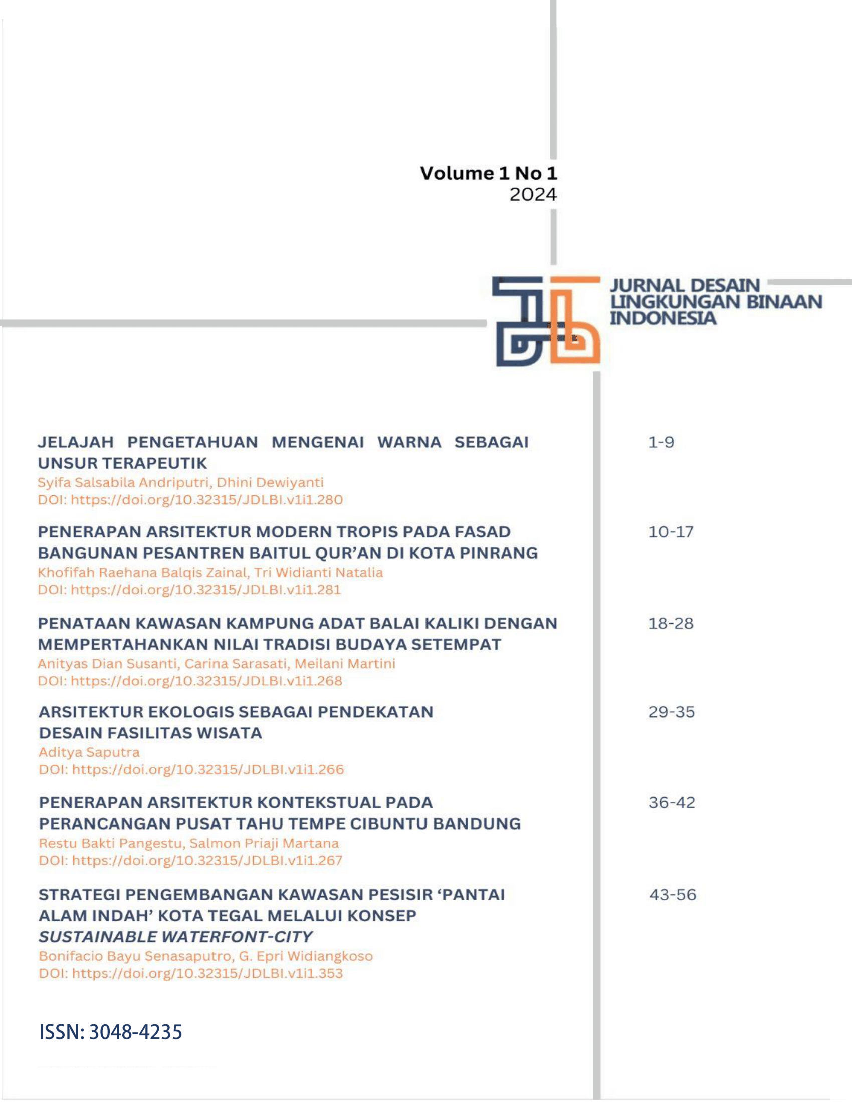 Edisi perdana Jurnal Desain Lingkungan Binaan Indonesia (JDLBI) Volume 1 Nomor 1 Tahun 2024 menyajikan enam artikel yang membahas berbagai pendekatan dalam desain lingkungan binaan, mulai dari eksplorasi warna sebagai unsur terapeutik dalam ruang, penerapan arsitektur modern tropis pada fasad pesantren di Pinrang, hingga strategi pelestarian kampung adat Balai Kaliki berbasis nilai budaya lokal. Isu keberlanjutan juga hadir melalui pendekatan ekologi dalam desain fasilitas wisata, penerapan arsitektur kontekstual pada pusat tahu tempe di Bandung, serta konsep sustainable waterfront city untuk pengembangan kawasan pesisir Pantai Alam Indah di Tegal.