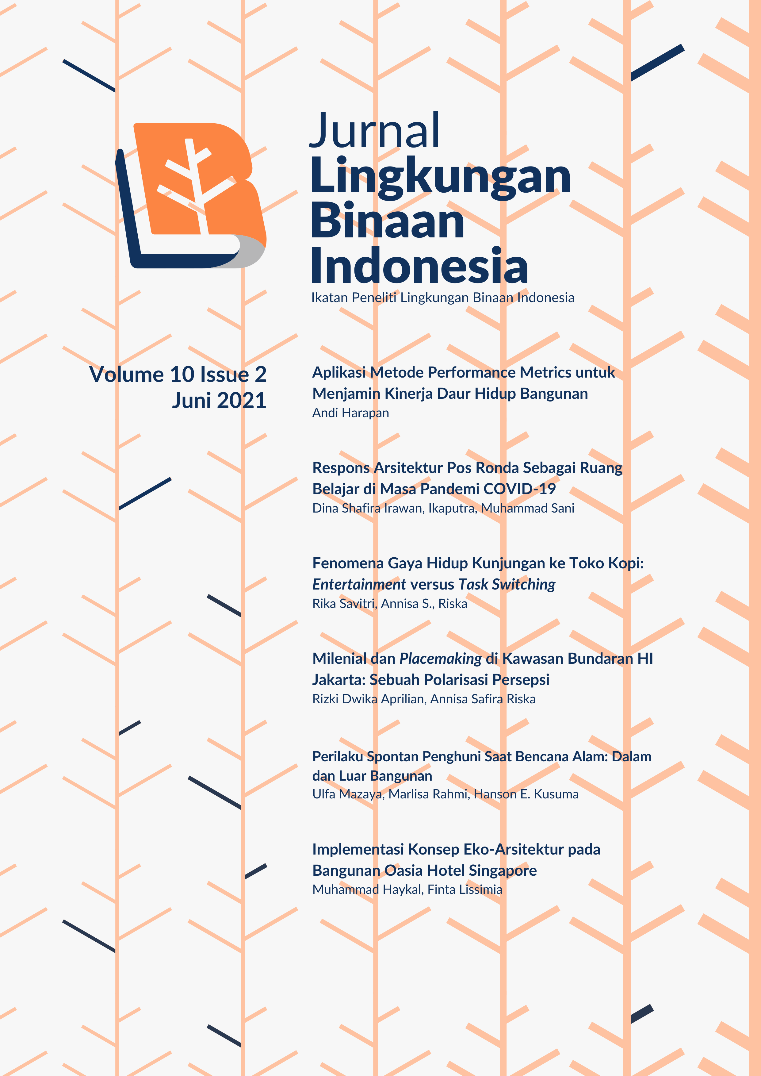 Volume ini memuat enam naskah. Naskah berjudul Aplikasi Metode Performance Metrics Untuk Menjamin Kinerja Daur Hidup Bangunan meruapakan naskah yang memperlihatkan sebuah aplikasi yang dapat diterapkan untuk memperlihatkan kinerja daur hidup bangunan. Dalam era pandemik, banyak ruang yang dioptimalkan sebagai ruang yang dapat digunakan untuk berkegiatan secara aman. Salah satu bangunan yang digunakan di luar fungsi utamanya adalah pos ronda. Naskah berjudul Respons Arsitektur Pos Ronda Sebagai Ruang Belajar di Masa Pandemi COVID-19, mengungkapkan kegiatan yang terjadi di sebuah pos ronda. Saat ini, gaya hidup menyenangi kopi sebagai minuman yang tidak saja untuk dinikmati, namun juga sebagai identitas kelompok, juga tengah dialami di Indonesia. Naskah berjudul Fenomena Gaya Hidup Kunjungan ke Toko Kopi: Entertainment versus Task Switching mencoba mengungkapkan hubungan yang terjadi pada para penikmat kopi di toko kopi tertentu. Sementara itu, naskah Milenial dan Placemaking di Kawasan Bundaran HI Jakarta: Sebuah Polarisasi Persepsi, sebuah penelitian mengenai persepsi dari pengguna ruang di kawasan Bundaran HI, Jakarta. Indonesia merupakan negara yang seringkali mengalami bencana. Penelitian berjudul Perilaku Spontan Penghuni Saat Bencana Alam: Dalam dan Luar Bangunan, mengungkapkan respon spontan dari masyarakat ketika terjadi bencana. Respon ini dapat dijadikan sebagai masukan bagi perencana bangunan, agar mengakomodir desain untuk evakuasi saat terjadi bencana. Naskah terakhir dalam volume ini adalah sebuah penelitian mengenai konsep eko-arsitektur yang “dibaca” penulis pada sebuah bangunan hotel di Singapura.