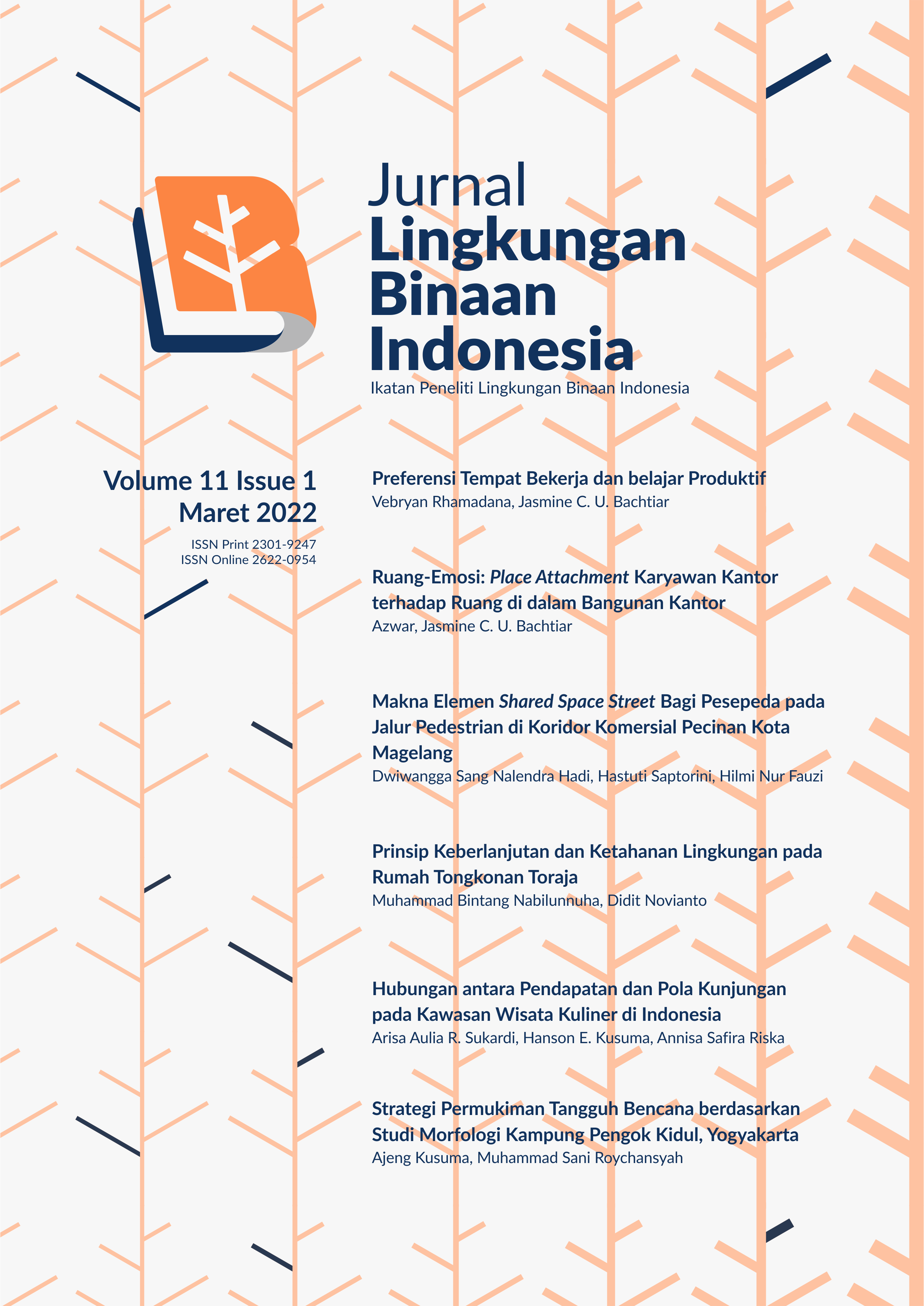 Edisi ini memuat enam artikel hasil penelitian. Preferensi Tempat Bekerja dan Belajar Produktif menunjukkan hasil penelitian mengenai tempat-tempat belajar yang disukai oleh responden, dan dianggap sebagai tempat produktif. Artikel berjudul Ruang-Emosi: Place Attachment Karyawan Kantor terhadap Ruang di dalam Bangunan Kantor adalah hasil penelitian terkait dengan lingkungan tempat bekerja. Sementara artikel berjudul Makna Elemen Shared Space Street Bagi Pesepeda pada Jalur Pedestrian di Koridor Komersial Pecinan Kota Magelang, menunjukkan fenomena kekinian tentang orang-orang yang kini menjadi gemar bersepeda, dan mereka menunjukkan tempat-tempat bermakna. Fenomena kearifan lokal dari arsitektur vernacular ditunjukkan melalui naskah berjudul Prinsip Keberlanjutan dan Ketahanan Lingkungan pada Rumah Tongkonan Toraja. Penelitian yang mengarah pada wisata kuliner dilakukan dalam naskah berjudul Hubungan antara Pendapatan dan Pola Kunjungan pada Kawasan Wisata Kuliner di Indonesia. Kekuatan ketahanan permukiman yang diperlihatkan oleh penelitian berjudul Strategi Permukiman Tangguh Bencana berdasarkan Studi Morfologi Kampung Pengok Kidul, Yogyakarta.